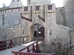 Deux ponts-levis (œuvre récente) équipent le château (ponts-levis de porte charretière et de porte piétonne, ou guichet, tous deux équipés de leurs flèches, tabliers et contrepoids)[5].
