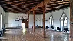 Le bâtiment de deux étages à plan rectangulaire de dimensions 28 × 17 mètres est doté d'un toit en demi-croupe massif. Alors que la salle supérieure occupe toute la largeur du bâtiment, la salle inférieure est située à côté d'un couloir. Une bande de fenêtres gothiques à arcades en plein cintre avec des fenêtres jumelles en arc brisé orne toute la longueur de la petite salle du côté sud, tandis que les arcades sont absentes des fenêtres jumelles de l'étage supérieur. Les fenêtres de la partie inférieure du mur nord sont rectangulaires. Le toit est recouvert de tuiles alsaciennes[56].