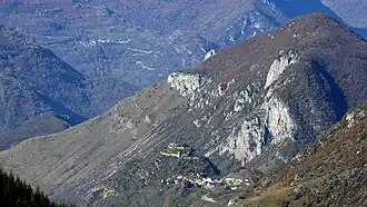 Le château de Lordat avec le village en contrebas et le pic Calmont (1234 m). | ||||