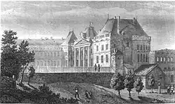 - 6e incendie, le . Le sinistre éclate à 6 heures du matin au même endroit qu’en 1719, au premier étage du pavillon regardant la terrasse. Le feu éclate dans l’appartement de l’aide de camp du général et se propage dans les combles, menaçant le donjon et la chapelle. Les pompiers arrivent à le neutraliser en faisant des pare-feux et en coupant les bâtiments et les charpentes au niveau du corps central et au niveau des petites ailes donnant sur la place du théâtre. Le feu a ainsi été circonscrit au pavillon qui est resté isolé. À l’époque, les gens formaient une chaîne avec des seaux en bois depuis le canal, et il a fallu 24 heures pour maîtriser l'incendie[7]. Les chutes de poutres et de cheminées ont causé beaucoup d’accidents, dont deux graves : deux militaires, dont l’un a été amputé d’un pied et l’autre de deux doigts.