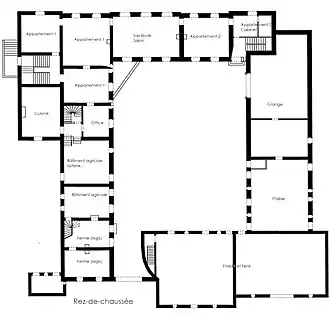 L'ensemble, malgré des façades assez monumentales présente des circulations intérieures et extérieures atypiques et peu hiérarchisées. L'accès au château se fait par une porte cochère, peu différente de celle d'une ferme et la cage d'escalier principale est uniquement accessible après avoir traversé un appartement de parade[2].