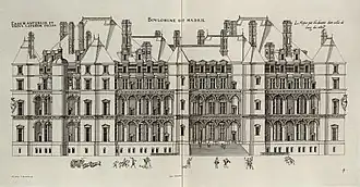 - ↑ Le catalogue complet des fragments conservés du château de Madrid, ainsi que la liste exhaustive de ses représentations, a été publié en 2012 en rapport avec les relevés effectués avant 1866 par l'architecte Victor Parmentier et conservés à la bibliothèque historique de la Ville de Paris (voir la bibliographie : Chatenet, Meunier et Prévet). Notons que ce qui a été présenté comme une découverte en 2011 par les conservateurs, n'en était pas une puisque les fragments étaient déjà présentés dans le no 1 de la revue Le Bibliophile en 1933 (p. 40)