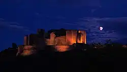 De plus, le château est ceinturé par des parois, qui regroupent dix tours[15]. Le mur d’enceinte est composé de briques de forme rectangulaire, dont la mesure est de 4,5-5 × 15 × 29-30 cm[16]. Les tours sont de deux formes différentes, dont trois tours sont de forme pentagonale et sept tours sont de formes rectangulaires. D’ailleurs, il est pertinent de mentionner l’extraordinaire solidité de ce château médiéval, car elle a résisté à de nombreux tremblements de terre au cours de son histoire.