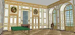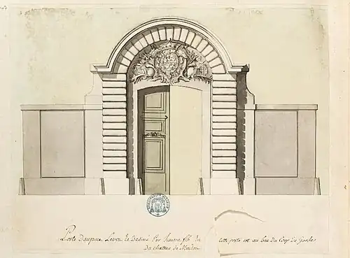 Le Grand Dauphin fit faire de grands travaux au château de Meudon et contribua de sa cassette particulière aux frais et aux embellissements de ce château pour une somme de un million cent quarante mille livres, quoique le roi son père l'eût mis au nombre des habitations royales et à la charge des bâtiments de la Couronne[11]. Durant 16 années, on dépensa au moins 3 millions de livres pour embellir et entretenir le domaine, somme colossale. Le prince fait redécorer les appartements à son goût. Le Dauphin laisse s'exprimer à Meudon ses propres conceptions artistiques, rompant avec l'aspect parfois compassé du style Louis XIV. Sans que cela soit réalisé pour la première fois, on systématise à Meudon l'utilisation des boiseries « à la Capucine », lambris de bois sculptés et vernissés, rehaussé d'or. Le style Régence se met en place en partie à Meudon. Le Dauphin réunit au château ses riches collections, qui essayent de rivaliser avec celles du roi : vases d'agate, tissus des Indes, tapisseries des Gobelins, porcelaines de Chine, tableaux de grands maîtres et surtout sa collection de gemmes. Il n'hésite pas à faire décorer certaines pièces à plusieurs reprises, supprimant par exemple le plafond peint par Charles de La Fosse pour laisser s'exprimer le style léger de Claude Audran III. Son principal appartement était situé tout le long du rez-de-chaussée de l'aile Est du Château-Vieux. Il disposera également de l'appartement de parade du Château-Neuf, ainsi que d'un « Petit appartement Frais » aménagé dans l'aile des marronniers.