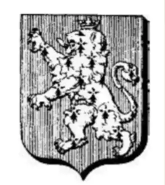 D’argent à deux fasces de sable, d'azur, semé de fleurs de lys d'argent, accompagné d'un lion, symboles de courage et de noblesse. L’écu est écartelé et fascé de six pièces. |