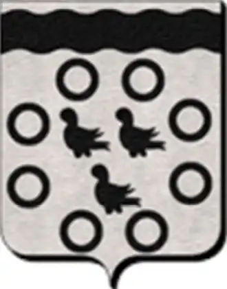 D'argent, à trois merlettes, rangés en orle, surmontés d'une fasce ondée, le tout de sable. L'écu est fascé et ondé. |