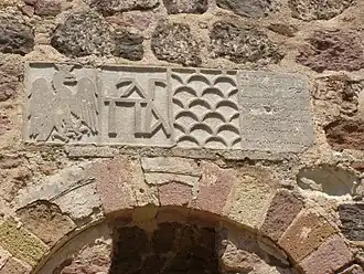 - Le monogramme et le bicéphale des Paléologue, à droite l'aigle dorien et au-dessus les armoiries des Gattilusi.