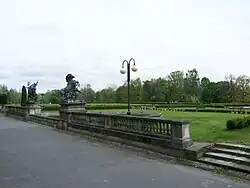 La partie centrale fut dotée d'un haut toit et d'une petite lanterne, surplombant ainsi les ailes nord et sud du château. Quatre toits plus élevés et des oriels furent rajoutés sur les côtés. Au sud et au nord de l'édifice, des pavillons d'un étage furent construits. En face de l'entrée ouest, une horloge et une clôture en fer forgé furent ajoutées pour les invités, clôture formant une place en forme d'arc en demi-cercle. Cette clôture était reliée par un imposant portail couronné de lions (aujourd'hui dans le zoo de Chorzów). Des balustrades furent érigées sur le côté est, à partir desquelles le lac était facilement accessible via des escaliers. Ces terrasses ainsi que les bassins et les sculptures sont les seuls éléments qui ont pu être conservés après la destruction du château en 1961. Ils permettent en effet de deviner la splendeur originelle du site. Les remarquables sculptures, représentant des luttes d'animaux, furent créées par le sculpteur français Emmanuel Frémiet[1].