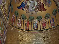 Le trône lui-même, conçu en or et en ivoire, n'a jamais été réalisé, car le roi est mort avant. La plate-forme est encadrée par des peintures représentant les douze Apôtres, et derrière la plate-forme, on peut voir un motif de lions d'or, symbole de la Bavière. Sur fond doré sont représentés six rois européens du Moyen-Âge canonisés (de gauche à droite : Casimir de Pologne, Étienne de Hongrie, Henri II du Saint-Empire, Louis IX de France, Ferdinand III de Castille, et Édouard le Confesseur qui symbolisent l'idéal du chevalier, soldat du Christ. À noter que Louis II était né le jour de la fête de son saint patron.