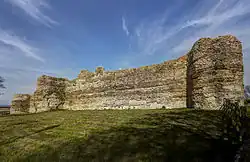 Le mur d'enceinte du château est construit à grande échelle, avec des courtines et des tours en saillie encore debout, mesurant jusqu'à 8,2 m de haut (probablement environ 9,5 m de haut lors de la construction) et 4,2 m d'épaisseur à la base[10]. Les sections nord, est et ouest du mur d'enceinte ont survécu pour la plupart intactes, à l'exception d'un segment écroulé du mur nord ; le mur sud, qui longeait directement la mer ou le marais, a presque entièrement disparu[11]. Il est recouvert de grès et de minerai de fer, bien que la plupart des pierres de parement d'origine aient été pillées au cours des siècles. La structure visible maintenant se compose principalement d'un noyau de moellons et de grès, lié avec du mortier. Des rangées de carreaux de collage traversent horizontalement le mur[8]. Une impression de son aspect d'origine peut être observée dans une zone du mur nord fouillée jusqu'aux fondations encore intactes, révélant l'ancien parement constitué de petits blocs de pierre[12]. Le mur avait à l'origine une apparence de gradins avec au moins deux niveaux de marches sur la face intérieure, bien qu'il n'y ait aucune indication survivante de la façon dont la garnison pouvait atteindre le sommet[6]. Au faîte de la muraille, les vestiges de l'époque médiévale laissent encore voir des créneaux, qui ont probablement remplacé les originaux romains[8].
