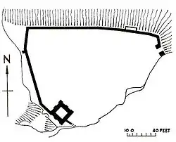 La courtine sud, située le long de la ligne de la muraille médiévale, est moderne, elle a été créée pour remplacer la précédente. On peut également voir les vestiges de deux tours en saillie rondes ou semi-circulaires. L'état de l'une d'entre elles permet encore de discerner l'utilisation de tuiles romaines dans la construction, probablement en provenance du fort de Navio, situé à 3,2 km. On ignore la date à laquelle ces tours ont été construites, bien que le XIIIe siècle soit évoqué. Les fondations marquent la position des bâtiments attenant au mur sud, probablement l'ancienne salle et une chapelle. Un document datant de 1246 mentionnait l'existence d'une chapelle au château; les restes de l'édifice oriental situé contre le mur sud sont supposés marquer le site de la chapelle puisqu'il est orienté plus ou moins est-ouest. Les fondations à l'extrémité ouest du mur marque l'emplacement éventuel d'un grand bâtiment; compte tenu de sa taille, il s'agissait probablement d'une salle où le seigneur prenait ses repas et se divertissait avec des invités au statut élevé. Il est difficile de savoir quand la nouvelle salle fut construite, probablement pour remplacer l'ancienne située au sud du château, bien qu'une « ancienne salle » était mentionnée dans un document de 1251, laissant entendre qu'il en existait aussi une nouvelle à ce moment-là. La cuisine et les magasins d'alimentation se seraient trouvés à l'extrémité est de la salle, mais il reste peu de ces structures. Des bâtiments furent également construits contre la courtine ouest, probablement des logements destinés aux personnes ayant un statut élevé.