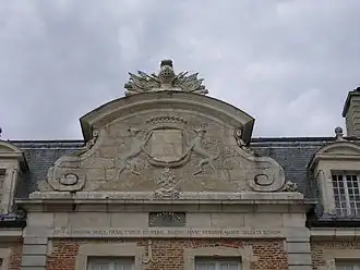 On y aperçoit les armes des Thiard : l'écusson aux trois écrevisses porté par deux lévriers