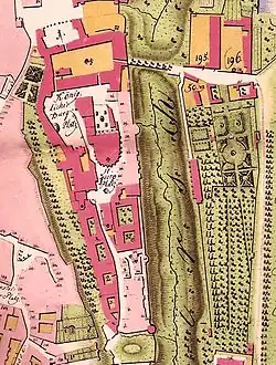 Ce plan de 1791, dressé par František Hegert, montre, en rose foncé, le château au centre, entre Malá Strana sur la gauche (sud) et le système de fortifications « à la Vauban » sur la droite (nord). Entre les fortifications et le château, on distingue le Fossé aux Cerfs (Hirsh Graben sur le plan, Jelení příkop en tchèque) et les Jardins royaux délimités à l'est (en bas) par le belvédère de la reine Anne et au nord (en haut) par les écuries (no 195 et 196 sur la carte), en leur milieu, et surmontant le Fossé aux Cerfs, le Pavillon du jeu de paume.