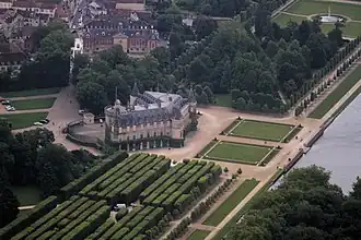 Fleuriau d'Armenonville, qui n'avait dépensé que 140 000 livres pour acquérir le domaine, y engloutit plus de 500 000 livres en l'espace de quelques années. Selon la tradition, c'est lui qui fait transformer les jardins à la française en créant une succession de parterres et de plans d'eau, alimentés par les nombreuses sources de ces terrains marécageux. Un canal est creusé dans l'axe de la façade sud-ouest du château et prolongé par un tapis vert. Un autre canal, perpendiculaire, longe les parterres de broderies qui s'étendent au pied du château. Au-delà de ces parterres sont aménagés trois bassins de formes différentes. Le parc est agrémenté de sculptures par Simon Mazière, Pierre Legros et René Frémin.