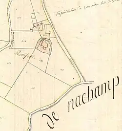 - ↑ Une acte de vente de la fin du XVIIIe siècle en fait l'inventaire suivant : « une grande salle, deux petites chambres, une cuisine, une pièce des […], trois chambres hautes, greniers au-dessus, deux belles caves, un caveau, un chay avec deux beaux greniers, un four avec fournil, le chay des chaudières, deux toits à volailles, une écurie, deux chambres qui fervoient aux métayers, un pavillon au-dessus le portail, un puits au milieu de la cour, deux toits à cochons et un jardin le joignant derrière. Contenant environ un journal clos de fossés et de murs, laquelle maison est entourée tout autour de large douves. »