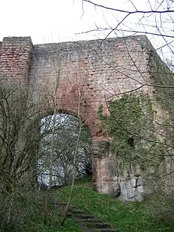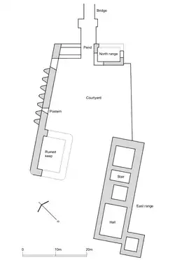 Au sud de ce mur se trouve le mur restant du donjon. Le monticule en contrebas est formé par les éboulis des trois autres murs. La ruine suggère que le donjon faisait approximativement 16 mètres et 12 avec des murs de 2,9 mètres d'épaisseur s'élevant jusqu'à un parapet pourvu de mâchicoulis[9].