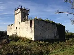 La haute tour carrée est datée du début du premier quart du XIVe siècle[3]. Elle est couronnée de mâchicoulis, dont seules les consoles sont conservées. En-dessous de celles-ci, à la place des créneaux, un mur plein a été bâti pour accueillir un pigeonnier. Des archères aujourd’hui obturées sont visibles sur sa façade sud. Ce donjon est orné d’une paire d’anciennes fenêtres géminées sub-trilobées, désormais aussi murées. Une canonnière est percée au centre d'une de ces baies. À l’extérieur, les coussièges (bancs placés de part et d’autre des fenêtres) sont conservés[2].
