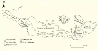 Les fondations du forum romain, ainsi que de celles de certains bâtiments ibériques et d'un temple romain ou d'un capitole, sont toutes situées dans la zone du forum du château[C 1], au sommet de la colline[C 2]. Les ruines des édifices romains sont disposées autour d'une place de 60 × 36,5 mètres. Sur le côté ouest de la place se situe une basilique de 60 × 20 mètres. Le côté est de la place est bordé d'une rangée de tabernae (boutiques). Au sud de la place se trouve une citerne bien conservée, et la base du temple ou du capitole se trouve du côté nord. Le temple mesure 14 × 12 mètres. Un bâtiment complexe est situé du côté nord-est de la place; il n'a pas été identifié de manière sûre mais il peut s'agir d'une curie (assemblée ou palais de justice) ou d'un temple d'Auguste, ce bâtiment possède deux grandes chambres parallèles pouvant remplir les deux fonctions. Les vestiges d'un théâtre romain se trouvent à environ 50 mètres en bas de la colline au nord-ouest du forum[C 2]. La construction de la citerne est probablement datée de la reconstruction de la ville après la deuxième guerre punique[H 2].