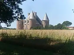 Le logis aux façades de briques apparentes est un pavillon carré à rez-de-chaussée sur sous-sol et un étage. Il a existé un second étage sous combles qui a été détruit par un incendie en 1945. Le logis est cantonné de tours rondes à deux étages sur rez-de-chaussée. Les toitures des tours de la façade nord, abattues à la Révolution, ont été restaurées en 1847.