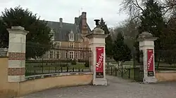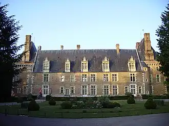 Construit en brique et en pierre, ceinturé de douves sèches, il se compose d'un grand corps de logis flanqué de deux pavillons assez massifs, que couronnent de faux mâchicoulis. Une certaine asymétrie règne dans le percement des ouvertures.