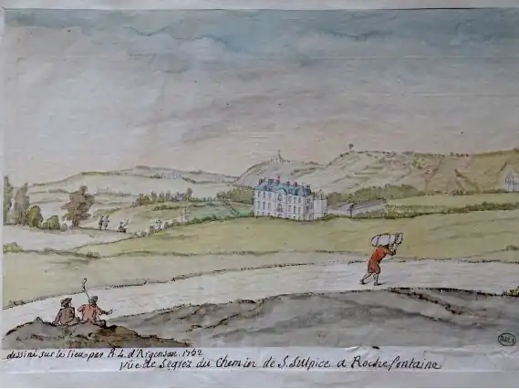 Aquarelle réalisée par le marquis d'Argenson en 1751 et conservée à la bibliothèque de l'Arsenal. La montagne de Segrez vue depuis la cour d'honneur du château.