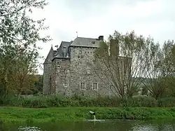 A l'est, le donjon du XIIIe siècle, massif et bâti principalement en moellons de grès, abritait la maison forte primitive. Il compte trois niveaux et possède des murs dont la largeur atteint 1,5 m[2]. Des peintures murales de style gothique tardif du début du XVIe siècle se situent sur la voûte en berceau et sur l’ébrasement d’une des baies, au premier étage du donjon.