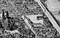 - Vu panoramique de Tours au début du XVIIe siècle, dont le château de Tours et le pont d'Eudes