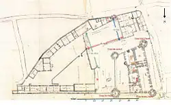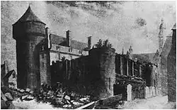 Seules deux tours de l'ancien château sont ainsi préservées, côté est, mais à peine rénovées. Elles sont reliées par un bâtiment de caserne, comportant trois étages, probablement construit vers 1781 ou proche de cette date[75],[note 24], connu aujourd'hui comme le « pavillon de Mars ». Ce dernier est édifié à l'emplacement de la grande cour intérieure de l'ancien château et de son enceinte est[3] et adossé aux ruines de la partie habitable délabrée du dit château, côté ouest, qui ne tarderont pas à être détruites (v. illustration).