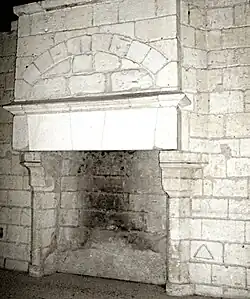 À l'intérieur, les escaliers en pierre sont d'origine, à l'exception de celui joignant les niveaux 4 et 5 refait en bois en 1978[102]. Reliés à l'origine par un escalier à vis contenu dans une tourelle extérieure en encorbellement, ces deux derniers niveaux, ajoutés au XVe siècle et plus bas de plafond (4 m), sont hexagonaux, éclairés par des baies carrées qui comportèrent des barreaux jadis. Ils sont plus vastes que les niveaux inférieurs, les murs étant plus fins qu'à la base (2 m au sommet et 2,80 m à la base)[36] ,[61] et comportent de belles cheminées engagées (hotte en retrait encastrée), parfaitement conservées, et en outre restaurées à l'époque moderne[note 37]. Les niveaux 1, 2 et 3 sont munis de meurtrières, certaines aménagées ultérieurement pour les armes à feu, en quinconce, dont l'ouverture en hauteur se rétrécit progressivement par niveau, de bas en haut (1,70 m, 1,40 m, 0,90 m)[103]. Certaines ouvertures ont été rétablies à l'époque moderne[104]. Aux niveaux 1 et 2 il ne restait des cheminées que les corbeaux et le contre-cœur avant la restauration de 1978 qui a restitué à celle du niveau 1 une hotte et un linteau en bois. Les salles de ces deux premiers niveaux dont la hauteur dépasse 6 m (6,25 m et 6,70 m) sont voûtés et leurs ogives retombent à chacun des deux niveaux sur six culs-de-lampe sculptés[105].