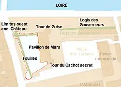Par exemple, au XVe siècle[25], la tour de Guise, qui subsiste encore de nos jours, voit son couronnement refait avec des mâchicoulis, ses niveaux complétés, en plus d'autres aménagements sur le logis. Une des poternes ouverte au nord est dotée en 1467 d'une échauguette[26]. C'est aussi à cette époque que Marie d'Anjou aurait ordonné la construction d'un bâtiment indépendant plus confortable, comportant trois étages, « L'ostel neuf du Roy », connu aujourd'hui comme le « Logis des Gouverneurs », qui emprunte également les fondations de l'enceinte gallo-romaine, en bord de Loire côté est, dans le périmètre de la basse-cour du château[27],[28].