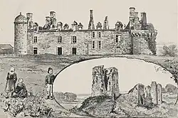 « [Du] pigeonnier on embrasse de biais tout l'ensemble du château. On voit, à droite, la façade dans laquelle se dessine la grande porte ogivale, en face de soi la tour ronde qui défendait l'angle gauche de cette façade ; à cette tour est une tourelle à pans coupés. Après avoir suivi la muraille à-demi écroulée, qui s'enfuit vers la gauche, l'œil aperçoit le donjon, haute tour carrée, sans toit, percé de nombreuses fenêtres. Tout cela est en ruines ; il ne reste pas un mur entier debout. Des corneilles innombrables, des chats-huants ont établi leur domicile dans le donjon que surmontait autrefois la bannière des Du Chastel. Mais ces ruines ont un aspect majestueux. Elles attestant de la grandeur de cette noble famille qui fut l'une des premières de Bretagne et dont deux des membres eurent l'honneur d'être inhumés à Saint-Denis, près des rois qu'ils avaient servis. »