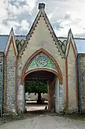 À l'entrée de la cour d'honneur sont bâtis deux pavillons, dont l'un abrite la chapelle. Ses peintures murales datent de la seconde moitié du XVIe siècle[3].