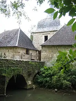 Un vieux pont de pierre permet de franchir la rivière de la Vaux. L'entrée est remarquable, avec un passage charretier, surmonté d'un comble en forme de carène renversée, « à la Philibert Delorme », couvert d'ardoises et surmonté d'un clocheton étroit. Les bâtiments sont du XVIIe siècle. Deux pavillons bas et dissymétriques, couverts d'ardoises également et abritant l'ancien corps de chasse et l'ancienne chapelle, encadrent cette entrée[1].