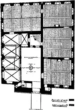 Le château est de forme quadrangulaire et ses dimensions sont de 23 x 24 mètres. La façade sud dépasse légèrement au-dessus de l'entrée. Au centre se trouve une cour avec une colonnade. La tour commence dans un coin de la cour. Il y a des caves sous tout le château, et l'épaisseur des murs varie de 1,60 mètre à 80 centimètres. Le château est entouré de douves et est accessible via un pont-levis.