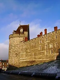 Du côté occidental de la partie basse se trouve une série de bâtiments datant du XVIe siècle accueillant les logements des chevaliers militaires et la résidence de leur gouverneur[56]. Ces chevaliers assurent les services religieux dans la chapelle Saint-Georges et représentent l'ordre de la Jarretière chaque dimanche[57]. Sur le côté sud de la partie basse, la porte Henri VIII porte les armoiries de Catherine d'Aragon et forme l'entrée principale du château.