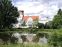 C'est au XVIe siècle qu'est formé un domaine seigneurial à Wrodow. Il se trouve à la limite du village de Mölln. En 1860, le propriétaire de l'époque, Ludwir Neumann, fait construire un château historiciste dans le style Tudor des châteaux romantiques néogothiques, avec des éléments typiques de l'architecture du nord de l'Allemagne, comme les pignons à gradins. Le corps de logis comprend deux étages avec au milieu un portique d'honneur composé de colonnes doriques et surmonté d'une terrasse au-dessous d'un pignon à gradins. Le corps de logis est prolongé de deux ailes en continu, l'une flanquée à droite d'une petite tour néogothique et l'autre à gauche d'un avant-corps à trois côtés surmonté également d'une terrasse marquant la limite du corps de logis et prolongée d'une partie surmontée d'un pignon. Le corps de logis est dominé par une haute tour néogothique donnant sur la façade arrière.