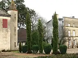 - Face à l'aile de 1810, se trouve une construction rectangulaire dont les murs sont légèrement talutés à leur base. Elle est percée d'une porte en plein cintre à encadrement en bossage rustique que surmontent, au-dessus d'armoiries ecclésiastiques martelées, les consoles à ressaut d'une bretèche.