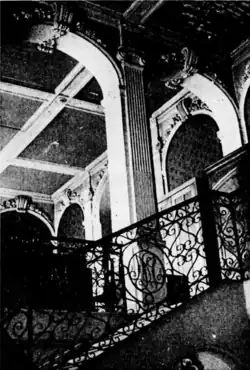 La distribution des pièces s'organise autour de l'entrée principale et d'un vaste palier à l'étage. Un très large escalier à deux volées, muni de rampes en fer forgé portant le chiffre "L.M.", distribue les étages[1].