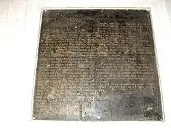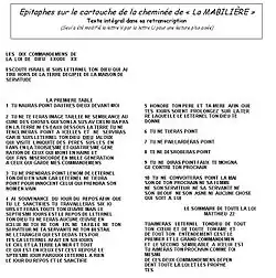 - À l'intérieur, dans une pièce haute de plafond, au-dessus de la grande cheminée, se voient les tables de la Loi; l'inscription entourée de moutures en bas-relief n'a pas pu être transporté d'ailleurs, car elle est gravée sur les pierres mêmes du mur. Les lettres d'or sur fond noir ont perdu beaucoup de leur éclat. Par endroits, elles ont été grattées ou recouvertes de plâtre. L'ensemble peut avoir 1 m. 75 de haut.
