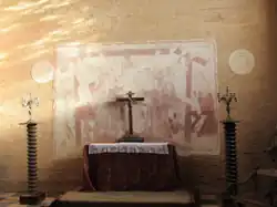 On retrouve dans la chapelle une peinture murale datée du début du XVIe siècle, et une série de treize cercles de consécration retrouvée lors de la restauration de 1984. L'ensemble est alors restauré[18]. La peinture murale, d’une dimension de 3 mètres 35 sur 2 mètres 15 représente une crucifixion avec saint Jean et la Vierge Marie. La chapelle possède aussi plusieurs statues classées au monuments historiques, représentant la Vierge, sainte Catherine d’Alexandrie, saint Sébastien, saint Jacques, sainte Barbe et enfin une crucifixion, le tout daté entre le XVe et le XVIIIe siècle, tout comme deux petits tableaux représentant une Vierge de douleur, et un Ecce Homo[19].