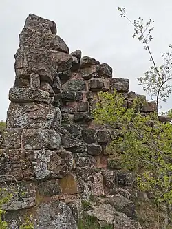 Façade en ruine du logis seigneurial, face sud. On distingue la trace de la cheminée entre les deux fenêtres du second niveau.