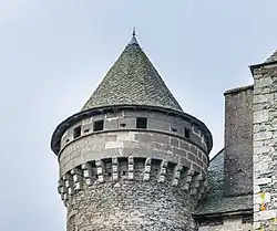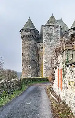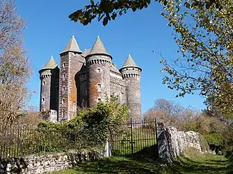 Le château construit en basalte brut, possession d'une famille de seigneurs depuis le XIIe siècle, est cantonné de six tours (deux hexagonales au milieu des deux façades avant et arrière, quatre rondes à chaque angle)[1]. Une des tours carrées abrite une chapelle orientée à l'est, et sa position sur le chemin de Saint-Jacques a fait dire que le château aurait pu être construit par les Hospitaliers[5].