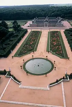 Les carrés sont encadrés par des volières côté jardins abritant une collection de poules, et, côté extérieur du parc, de serres d'orchidées, les plus grandes d'Europe. L'une d'elles, l'Orangerie, sert de salon chinois (ne se visite pas). Au centre des serres, un salon d'été, en hauteur, dans une loggia, permet d'avoir une superbe vue sur les jardins (ne se visite pas). Au pied de la loggia, le bassin de Diane. Il s'agit d'une fontaine ornée de multiples coquillages nacrés (des porcelaines).