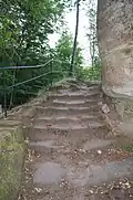 Entre Niedersteinbach et l'étang du Fleckenstein, sur la D 3, à la hauteur de la ferme de Froensbourg, suivre le sentier du Club vosgien, rectangle bleu.