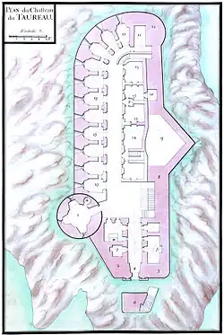 - 1741-1745 : l'achèvement du fort par Amédée François Frézier. Les travaux débutent dès le après leur adjudication. La première phase de travaux concerne l'achèvement de l'enceinte du côté est, c'est-à-dire entre le magasin à poudre et le grand escalier anciennement construit pour accéder à la plate-forme au-dessus de la porte d'entrée. Avant d'élever la nouvelle enceinte à l'est, les ouvriers ont commencé par détruire le parapet provisoire et la première assise. Ils ont ensuite effectué des sondages pour situer le rocher de l'îlot. Ils ont repiqué entièrement la pierre de taille du parement des deux faces du redan, et refait les anciens joints. Deux embrasures sont aménagées dans les deux faces du redan, « lesquelles serviront en même temps de fenêtre à la chambre qu'on doit y faire au niveau du premier étage du rez-de-chaussée de la partie intérieure du nouveau bâtiment régnant sur la cour du château ». Parallèlement aux travaux de l'enceinte à l'est, il va y avoir « des augmentations dans l'ancien bâtiment » de la partie sud en 1741. Cette « augmentation » est intéressante pour l'ingénieur Frézier dans la mesure où elle permet de gagner de la place rapidement et pour un coût peu élevé. Les travaux d'achèvement du fort du Taureau ont pour but de restructurer et rationaliser les espaces réservés aux officiers et à la garnison. Nous l'avons vu précédemment, la cour, jusqu’en 1741, est occupée par de petites constructions dispersées et très peu fonctionnelles. La pénurie de logements est telle que des chambres sont créées dans les combles des bâtisses, la citerne est indigne d'une place-forte et surtout, les bâtisses engouffrent chaque année une somme considérable en entretien ; il était devenu nécessaire de les raser et de construire un grand bâtiment à leur place. La construction du nouveau bâtiment démarre en 1742. Les murs du bâtiment s'appuient sur l'enceinte achevée l'année précédente. Pour construire le nouveau bâtiment, les bâtisses de la cour sont détruites, mais tout ce qui peut resservir est récupéré, mis en magasin et gardé précieusement, « pierres de taille, boutisses, carreaux, tours des fenêtres, portes, marches d'escalier, ferrures, plomberies, vitreries, menuiseries des portes et fenêtres, lambris, charpente ». La façade du nouveau bâtiment se trouve en saillie par rapport au mur d'enceinte et « déborde » sur la cour. Comme l'avait prévu Vauban en 1697, la construction de ce bâtiment accentue encore l'étroitesse de la cour et de la place d'armes. D'après une note sur le plan Frézier de 1742, la terrasse du nouveau bâtiment est achevée en 1745[14].