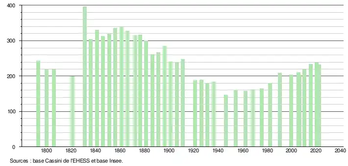 L'évolution du nombre d'habitants est connue à travers les recensements de la population effectués dans la commune depuis 1793. Pour les communes de moins de 10 000 habitants, une enquête de recensement portant sur toute la population est réalisée tous les cinq ans, les populations de référence des années intermédiaires étant quant à elles estimées par interpolation ou extrapolation[19]. Pour la commune, le premier recensement exhaustif entrant dans le cadre du nouveau dispositif a été réalisé en 2005[20].