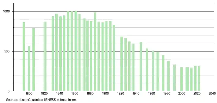 L'évolution du nombre d'habitants est connue à travers les recensements de la population effectués dans la commune depuis 1793. Pour les communes de moins de 10 000 habitants, une enquête de recensement portant sur toute la population est réalisée tous les cinq ans, les populations de référence des années intermédiaires étant quant à elles estimées par interpolation ou extrapolation[21]. Pour la commune, le premier recensement exhaustif entrant dans le cadre du nouveau dispositif a été réalisé en 2007[22].