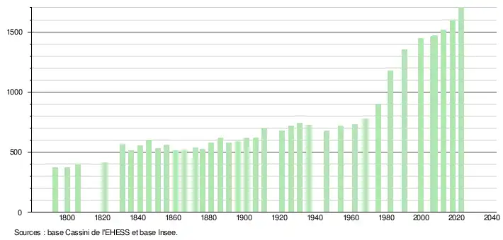 L'évolution du nombre d'habitants est connue à travers les recensements de la population effectués dans la commune depuis 1793. Pour les communes de moins de 10 000 habitants, une enquête de recensement portant sur toute la population est réalisée tous les cinq ans, les populations de référence des années intermédiaires étant quant à elles estimées par interpolation ou extrapolation[19]. Pour la commune, le premier recensement exhaustif entrant dans le cadre du nouveau dispositif a été réalisé en 2007[20].