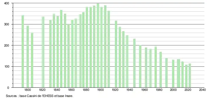 L'évolution du nombre d'habitants est connue à travers les recensements de la population effectués dans la commune depuis 1793. Pour les communes de moins de 10 000 habitants, une enquête de recensement portant sur toute la population est réalisée tous les cinq ans, les populations de référence des années intermédiaires étant quant à elles estimées par interpolation ou extrapolation[26]. Pour la commune, le premier recensement exhaustif entrant dans le cadre du nouveau dispositif a été réalisé en 2007[27].