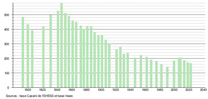 L'évolution du nombre d'habitants est connue à travers les recensements de la population effectués dans la commune depuis 1793. Pour les communes de moins de 10 000 habitants, une enquête de recensement portant sur toute la population est réalisée tous les cinq ans, les populations de référence des années intermédiaires étant quant à elles estimées par interpolation ou extrapolation[31]. Pour la commune, le premier recensement exhaustif entrant dans le cadre du nouveau dispositif a été réalisé en 2008[32].